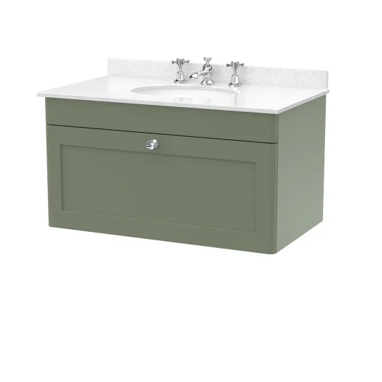 nuie Classique Wall Hung 1 Drawer Unit & 3 Tap Hole Marble Top with Oval Basin, 800mm - Satin Green/White