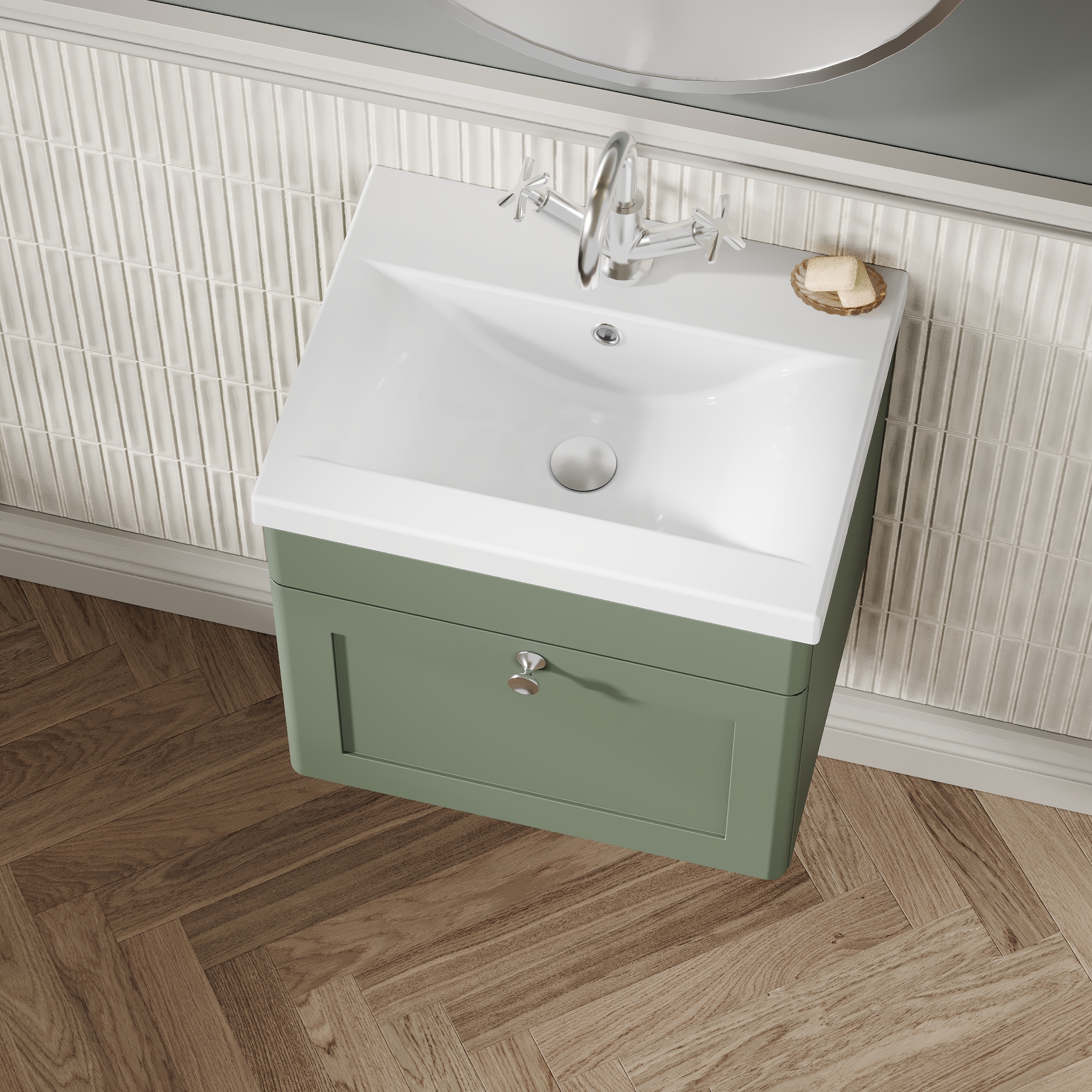 Nuie Classique 500mm Satin Green Wall Hung 1 Drawer Vanity Unit with 3 Tap Hole Fireclay Basin