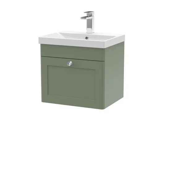 Nuie Classique 500mm Satin Green Wall Hung 1 Drawer Vanity Unit with 3 Tap Hole Fireclay Basin