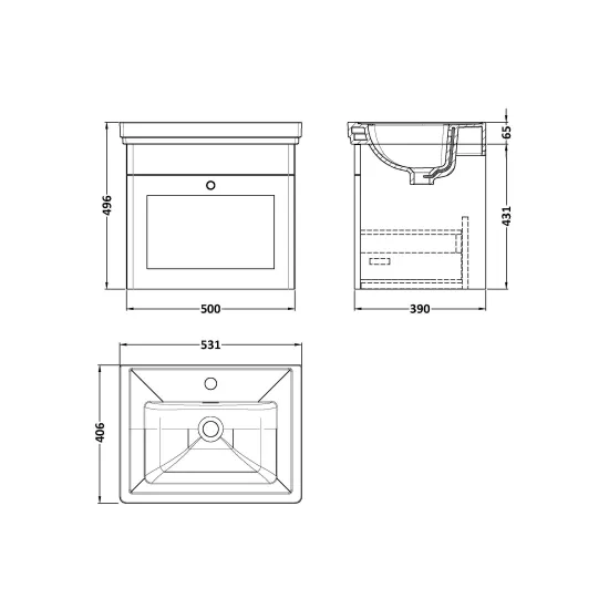 Nuie Classique 500mm 1 Drawer Satin White Wall Hung Vanity Unit With 1 Tap Hole Basin
