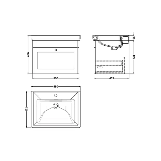 Nuie Classique 600mm 1 Drawer Satin White Wall Hung Vanity Unit With 1 Tap Hole Basin