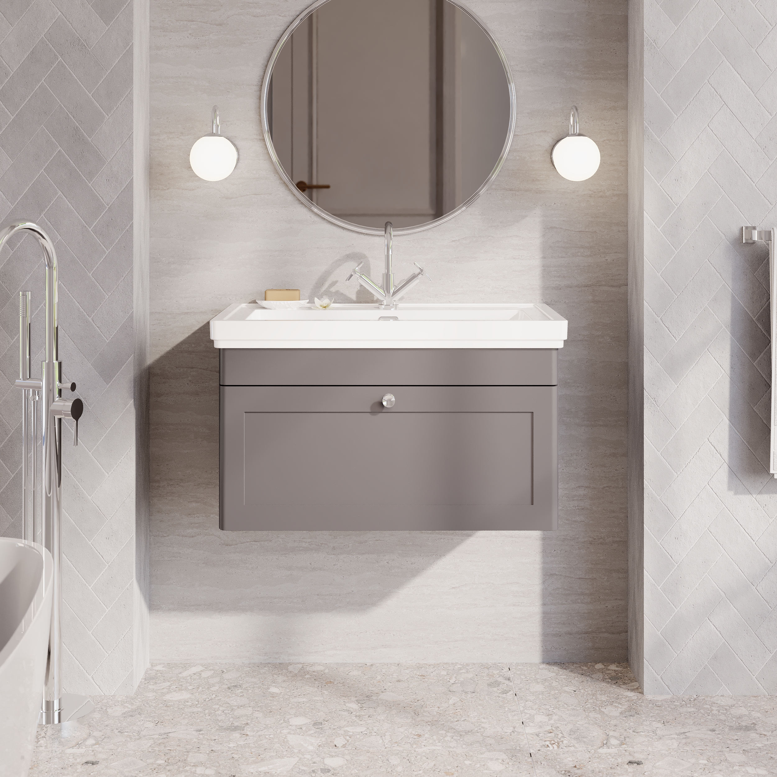 nuie Classique Wall Hung 1 Drawer Vanity Basin Unit & 1 Tap Hole Fireclay Basin, 800mm - Satin Grey