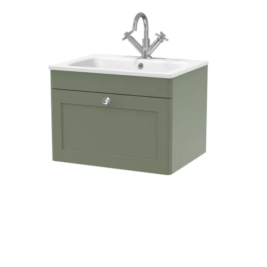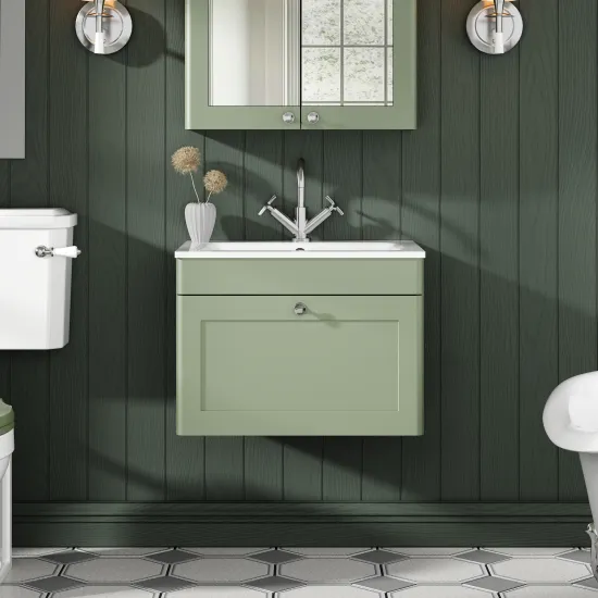 nuie Classique Wall Hung 1 Drawer Vanity Basin Unit & 1 Tap Hole Stone Basin, 600mm - Satin Green