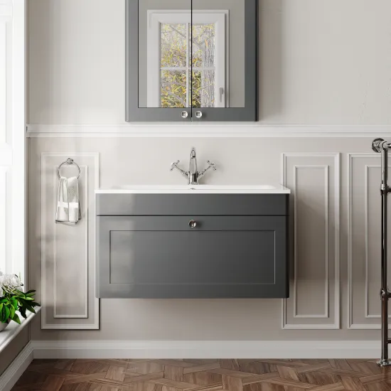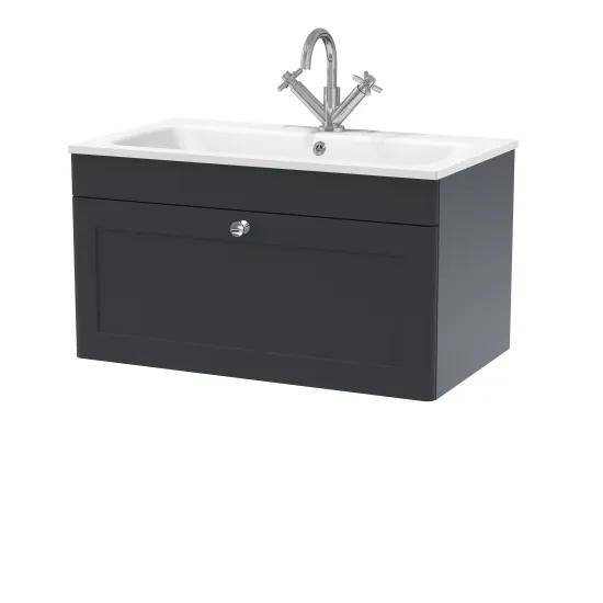 nuie Classique Wall Hung 1 Drawer Vanity Basin Unit & 1 Tap Hole Stone Basin, 800mm - Soft Black