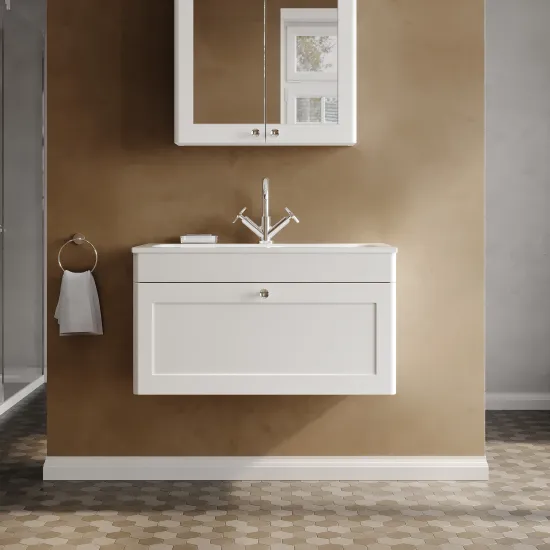 nuie Classique Wall Hung 1 Drawer Vanity Basin Unit & 1 Tap Hole Stone Basin, 800mm - Satin White