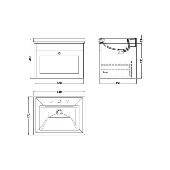 Nuie Classique 600mm Wall Hung 1 Drawer Vanity Unit with 3 Tap Hole Basin