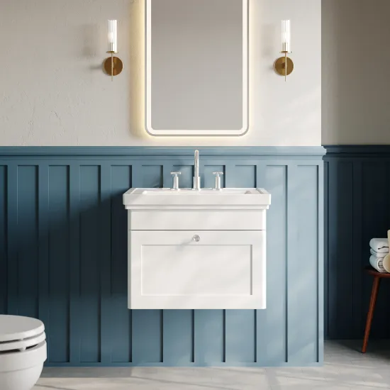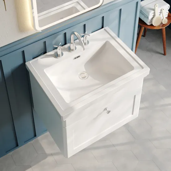 nuie Classique Wall Hung 1 Drawer Vanity Basin Unit & 3 Tap Hole Fireclay Basin, 600mm - Satin White