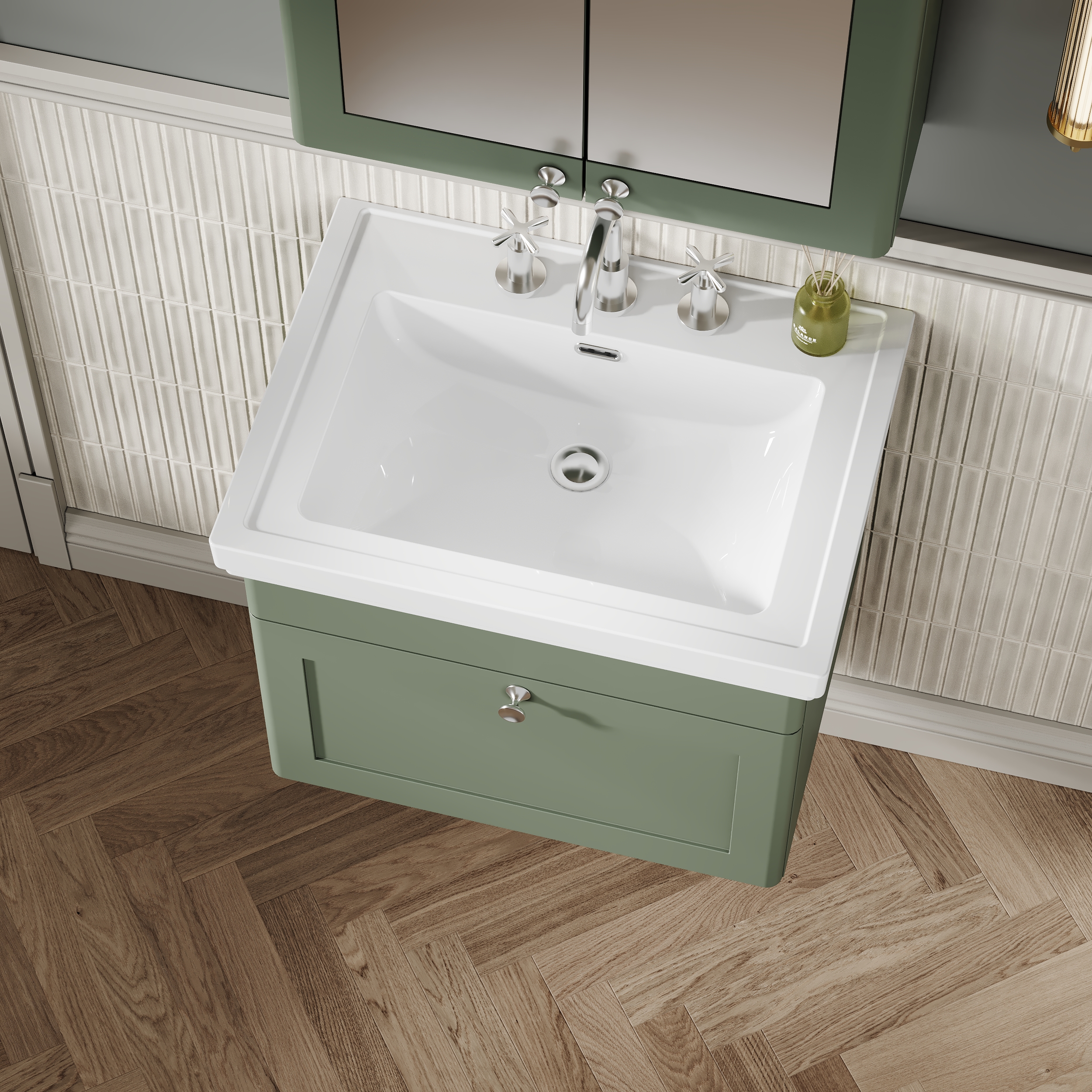 nuie Classique Wall Hung 1 Drawer Vanity Basin Unit & 3 Tap Hole Fireclay Basin, 600mm - Satin Green