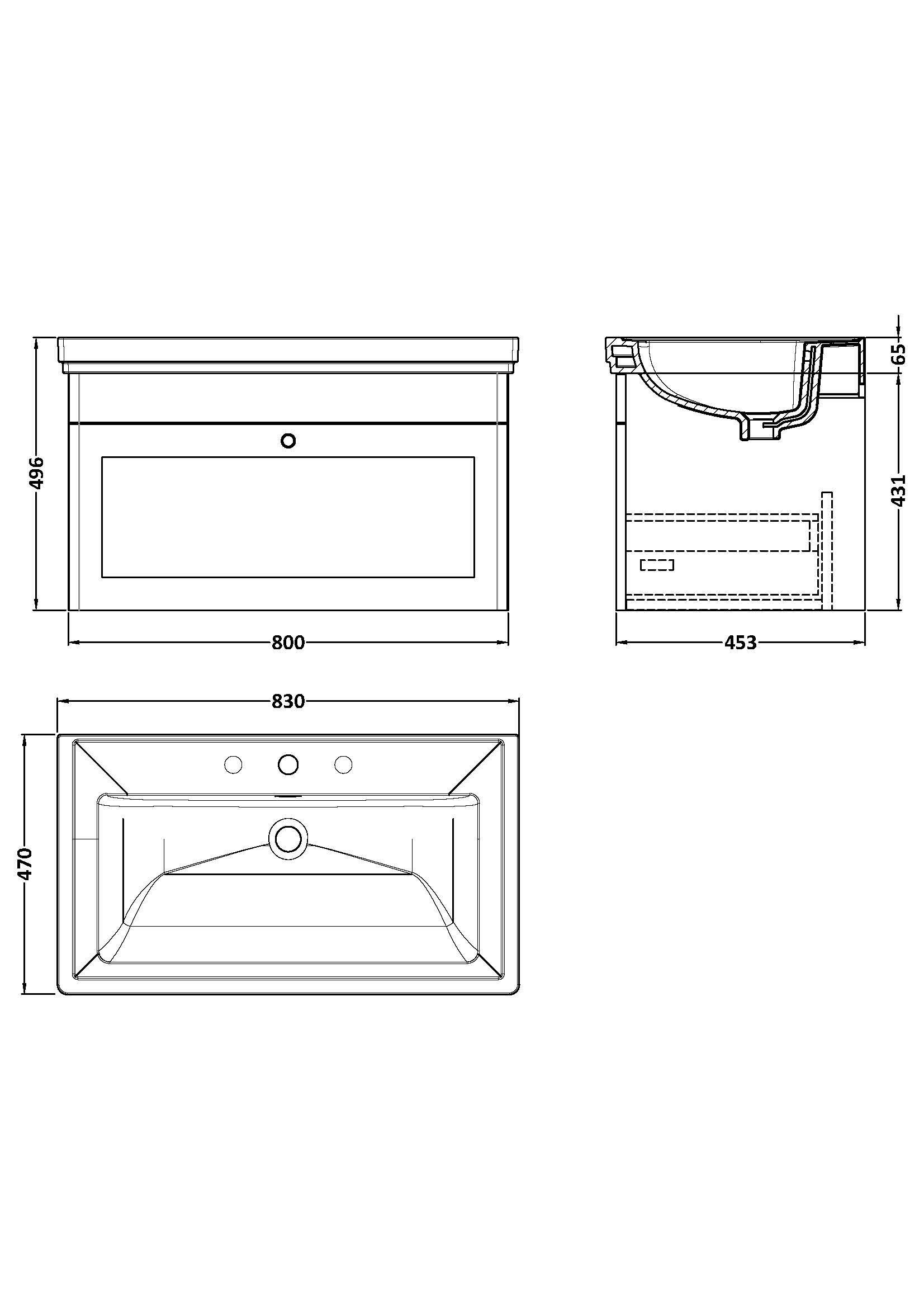 Nuie Classique 800mm 1 Drawer Satin Grey Wall Hung Vanity Unit With 3 Tap Holes Basin