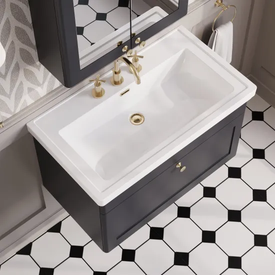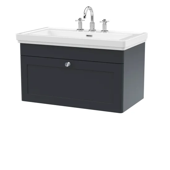 nuie Classique Wall Hung 1 Drawer Vanity Basin Unit & 3 Tap Hole Fireclay Basin, 800mm - Soft Black