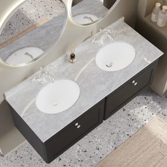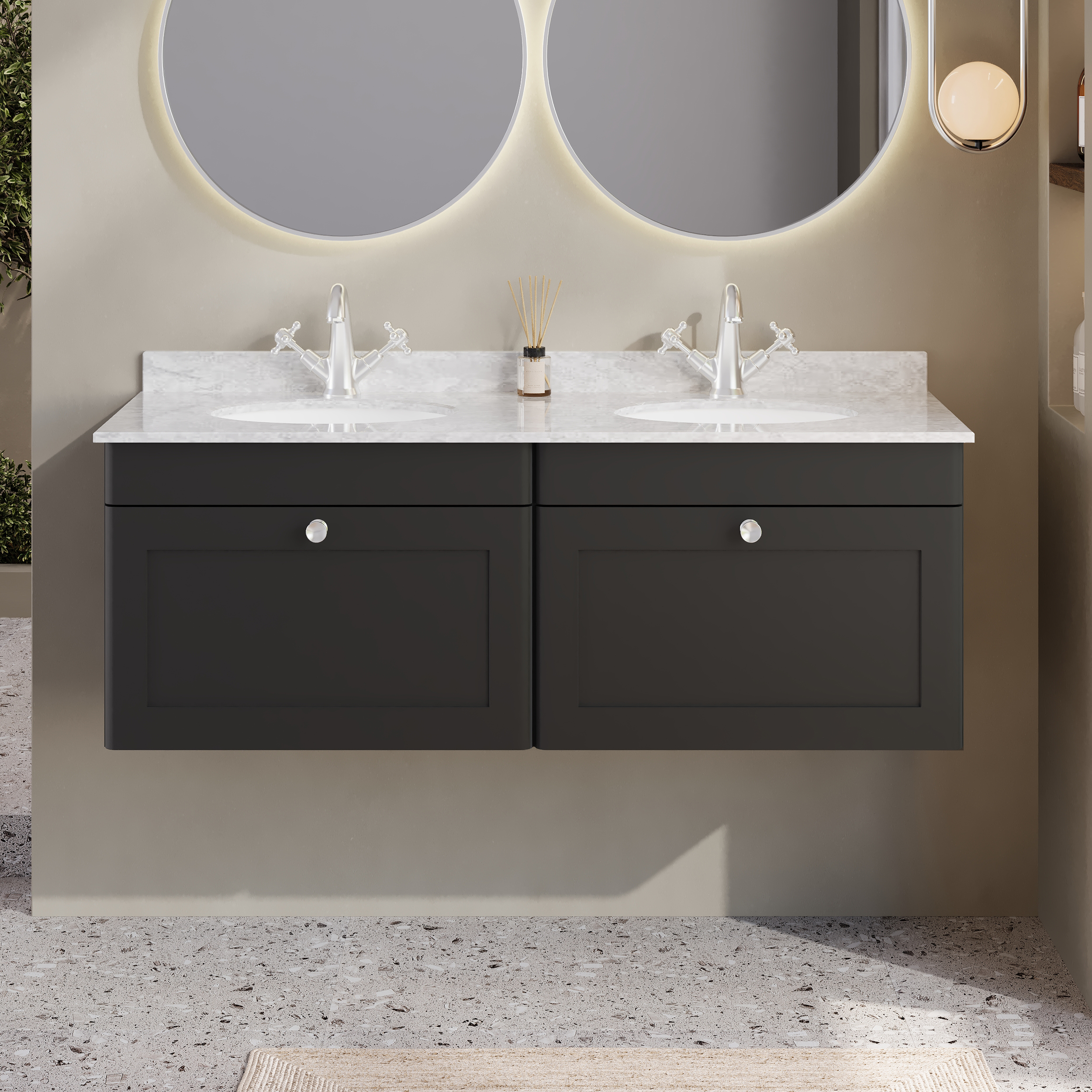 nuie Classique Wall Hung 2 Drawer Unit & 1 Tap Hole Marble Top with Oval Basin, 1200mm - Soft Black/Grey