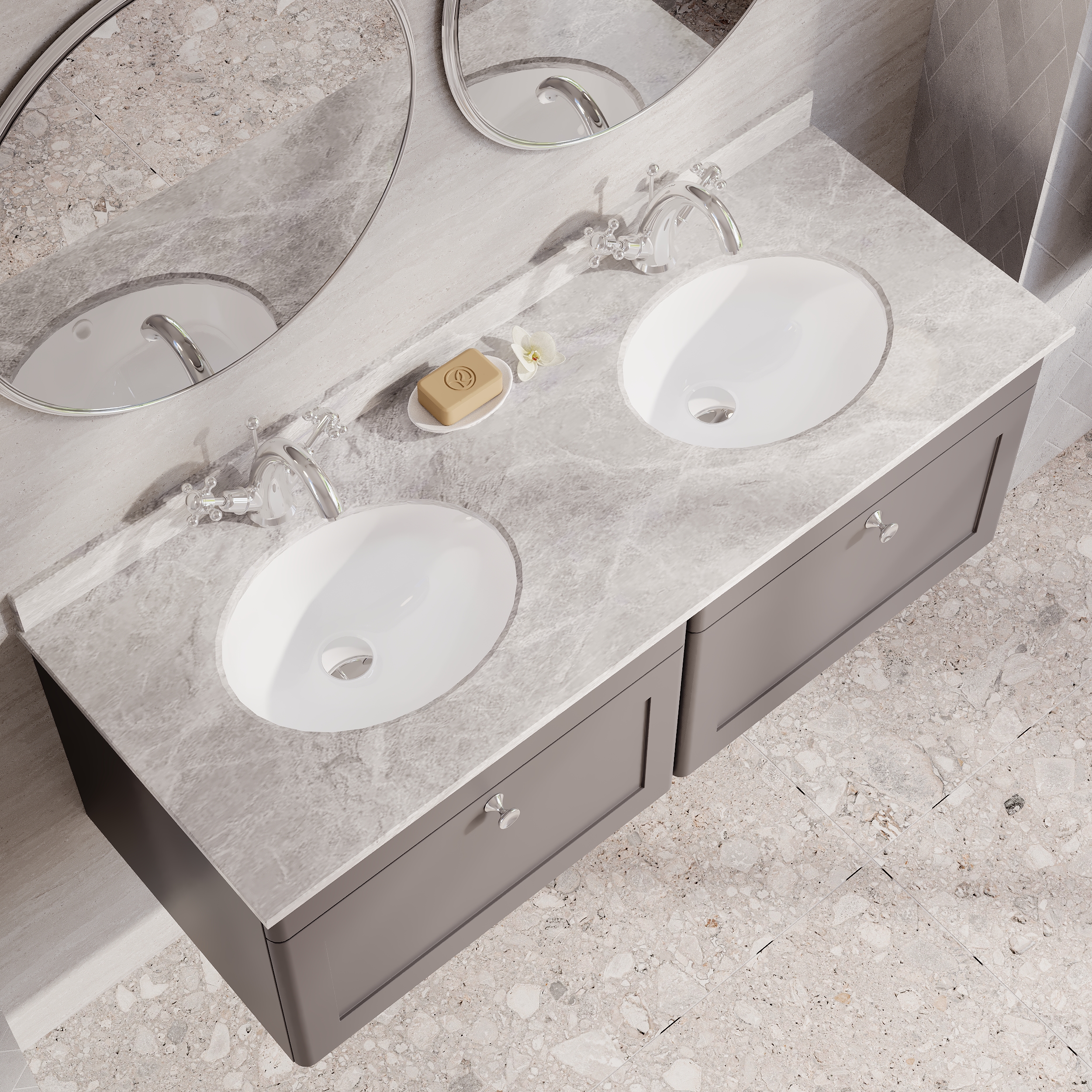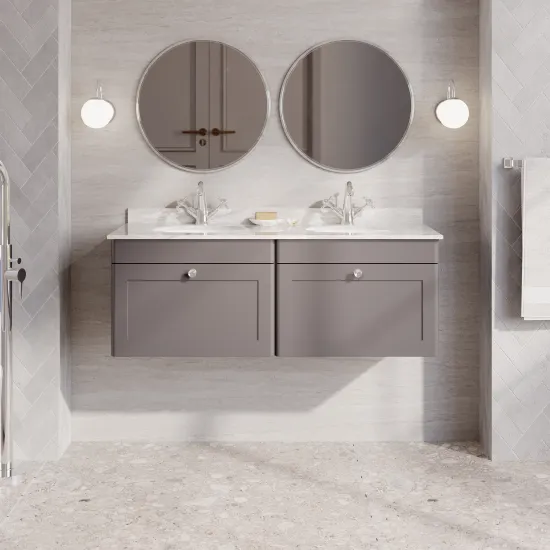 nuie Classique Wall Hung 2 Drawer Unit & 1 Tap Hole Marble Top with Oval Basin, 1200mm - Satin Grey/Grey