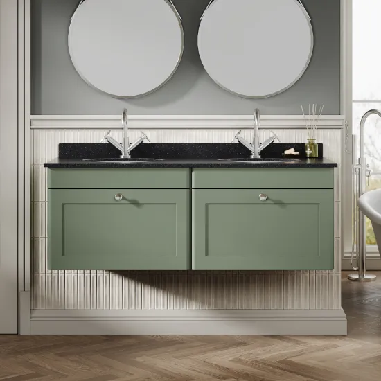 Nuie Classique 1220mm Satin Green Wall Hung 2 Drawer Vanity Unit with 6 Tap Hole Basin Including Backsplash