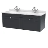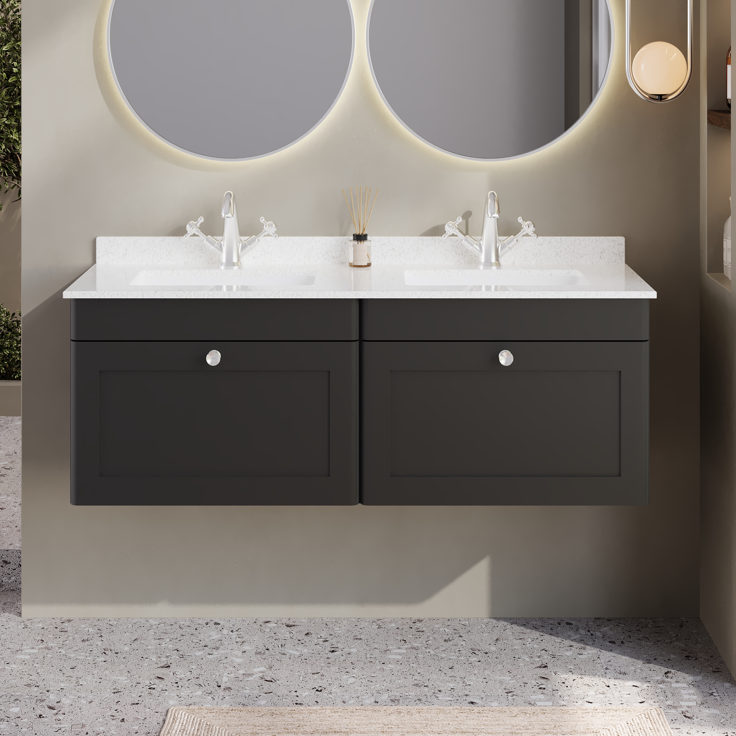 Nuie Classique 1220mm Soft Black Wall Hung 2 Drawer Vanity Unit With Round Basin, Backsplash & 2 Tap Holes