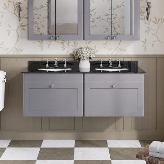 nuie Classique Wall Hung 2 Drawer Unit & 3 Tap Hole Marble Top with Oval Basin, 1200mm - Satin Grey/Black