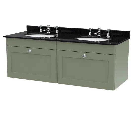 nuie Classique Wall Hung 2 Drawer Unit & 3 Tap Hole Marble Top with Oval Basin, 1200mm - Satin Green/Black
