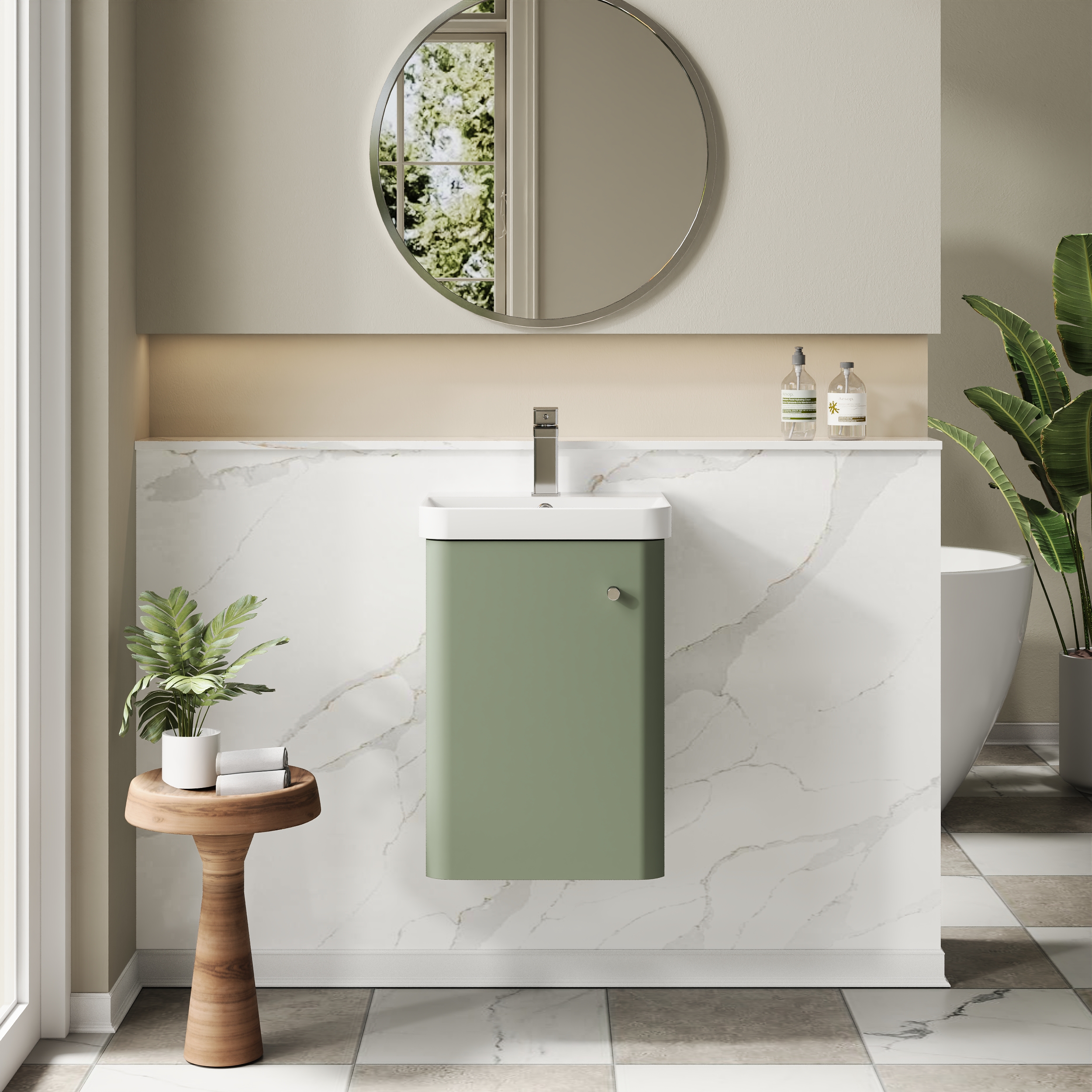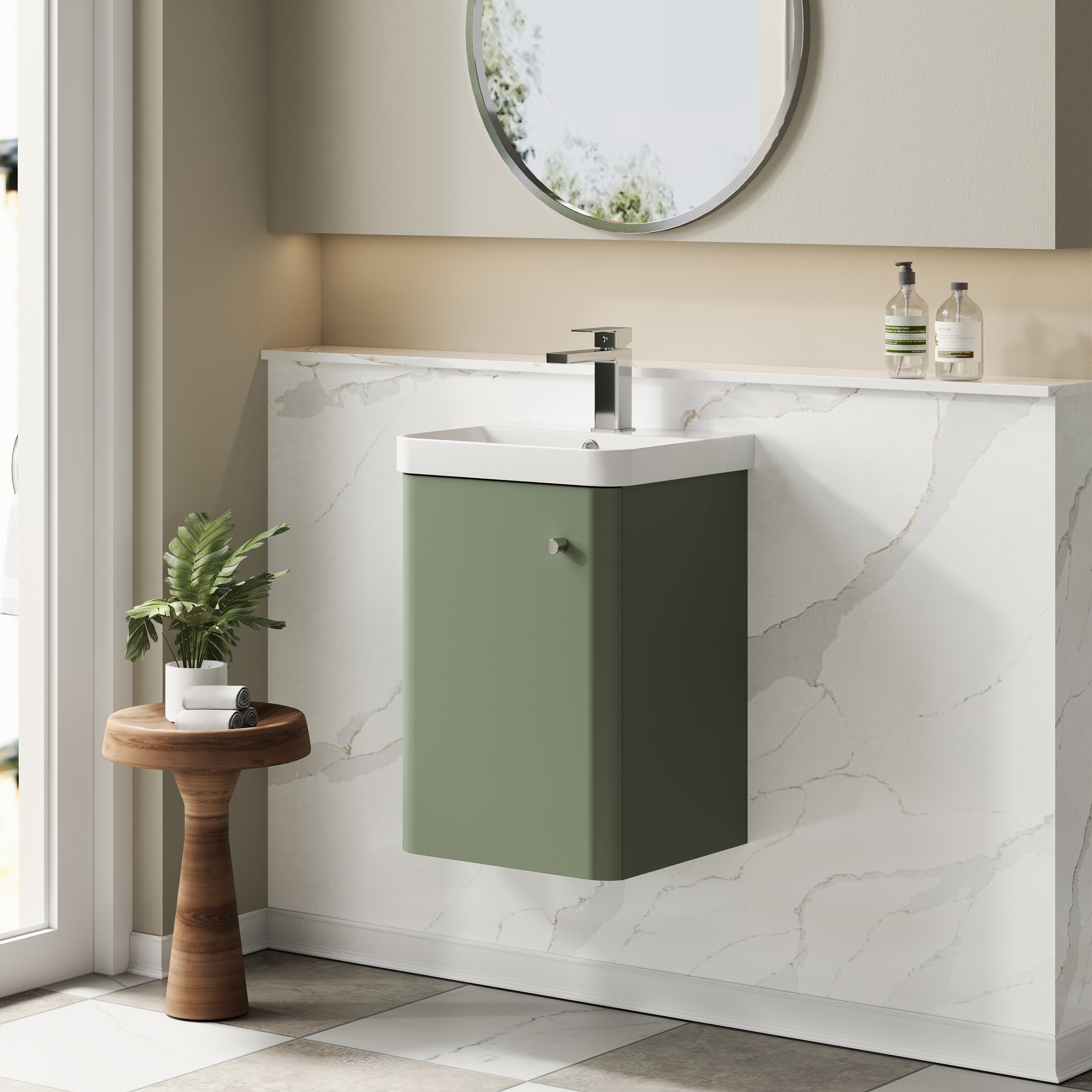 Nuie 500mm Satin Green Wall Hung 2 Door Vanity Unit & Basin With Soft Close Doors