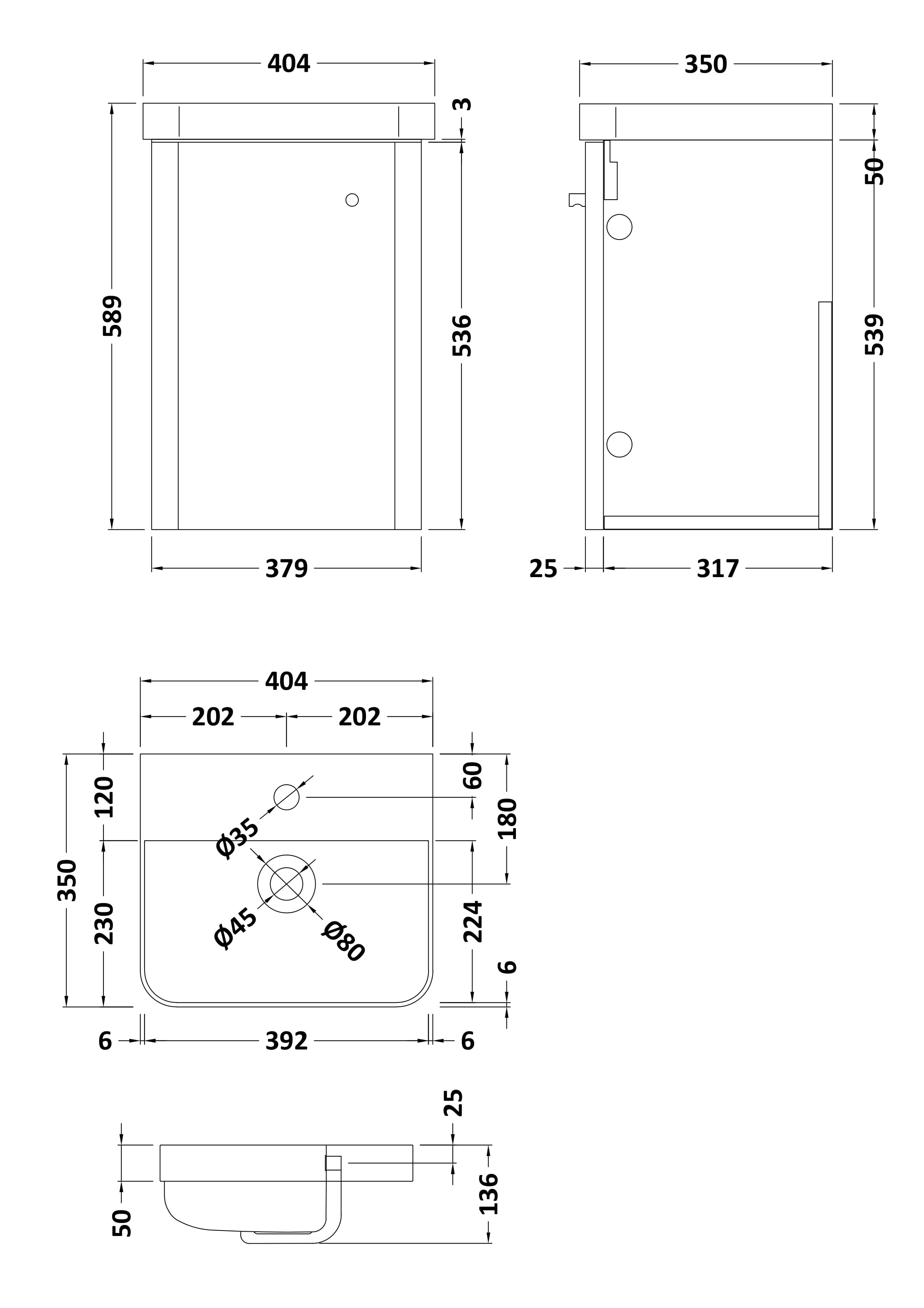 nuie Core Wall Hung 1 Door Vanity with Ceramic Basin and Handle 400mm - Gloss White/Matt Black