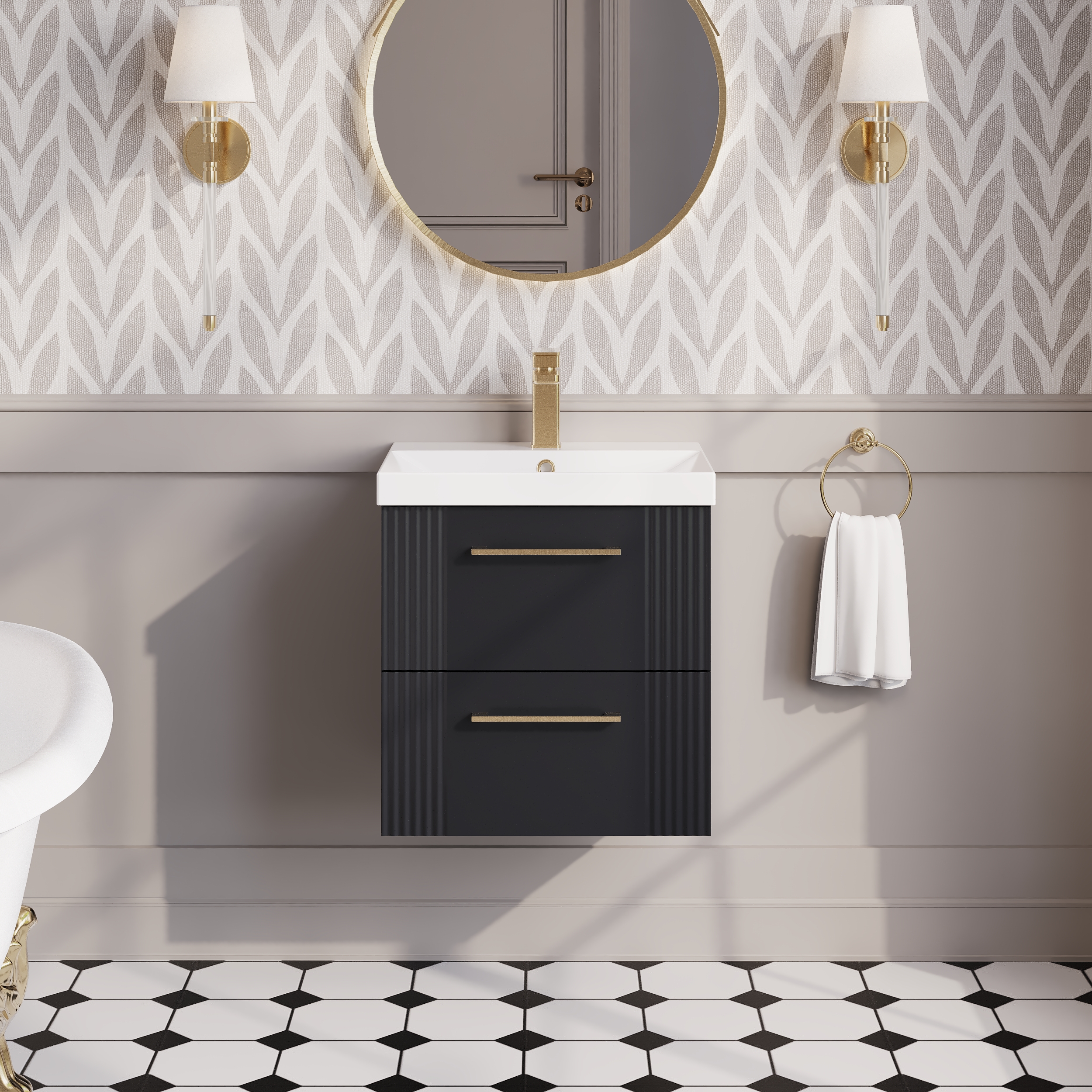 Nuie 500mm Soft Black Art Deco Wall Hung 2-Drawer Vanity Unit with Curved Basin With Chrome Handles