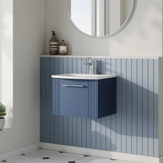 Nuie 500mm Satin Blue Wall Hung Single Drawer Vanity Unit with Basin and Handles