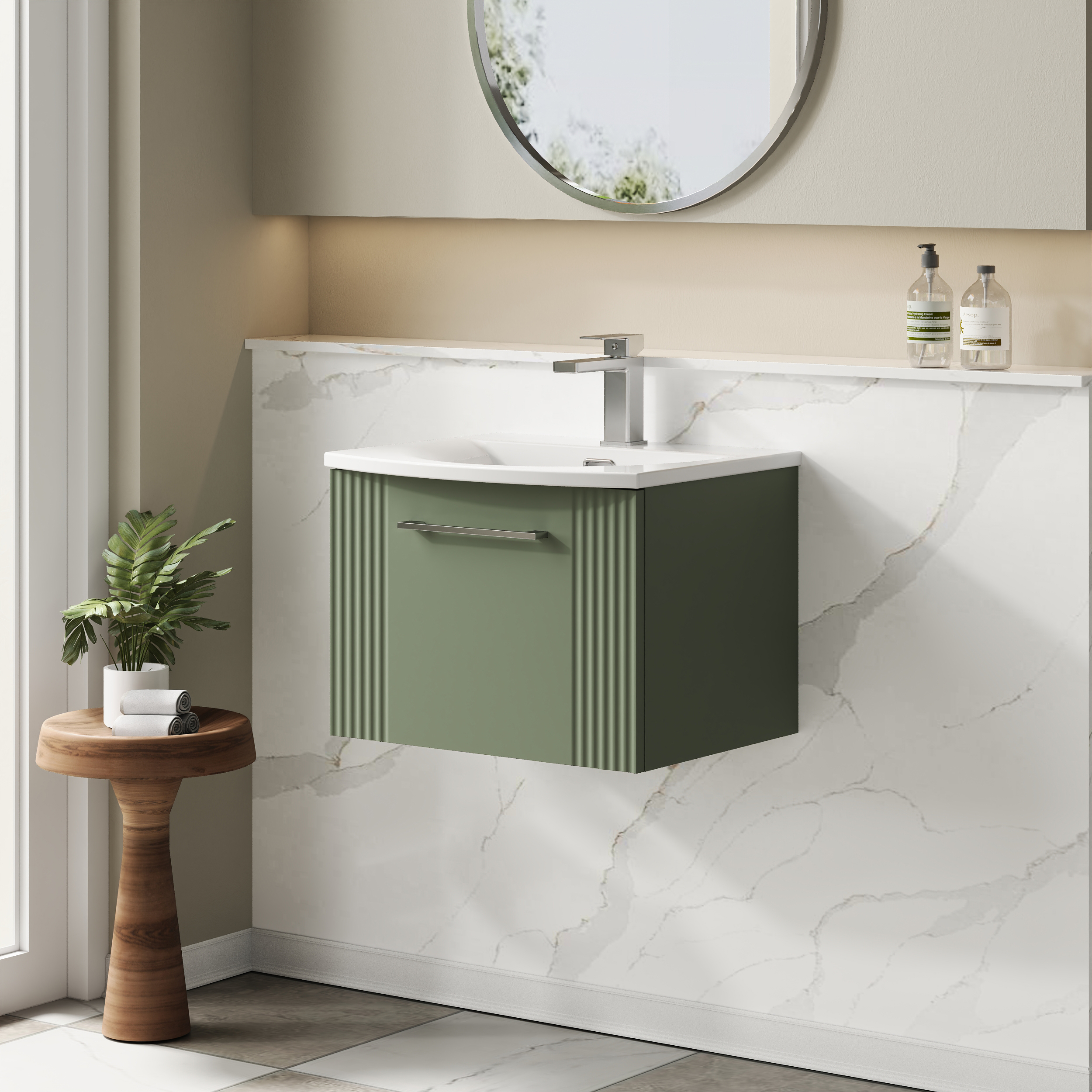 Nuie 500mm Satin Green Part Fluted Wall Hung Single Drawer Vanity Unit With Basin & Chrome Handle