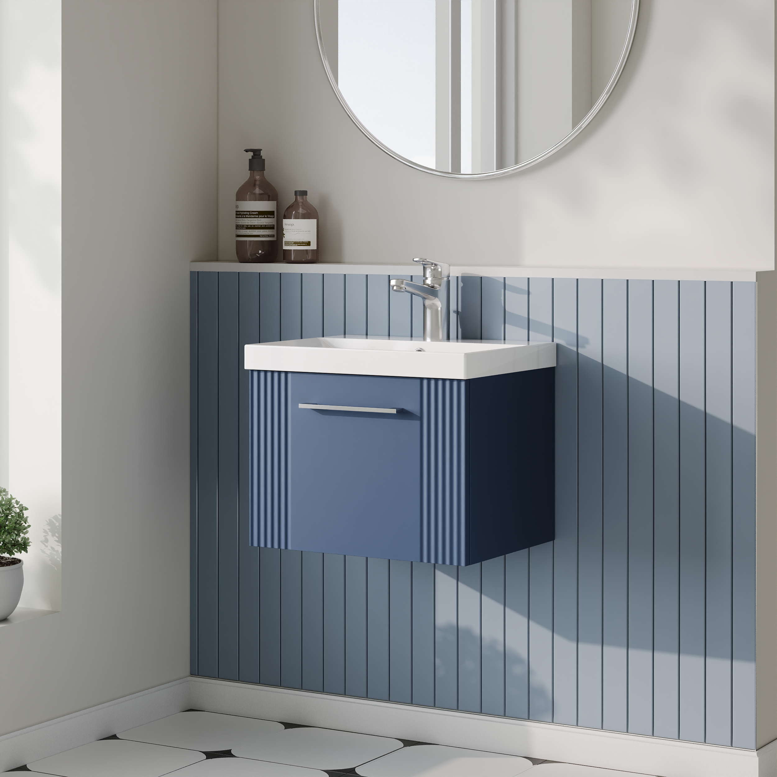 Nuie Deco 500mm Satin Blue Part Fluted Wall Hung Single Drawer Vanity Unit With Basin