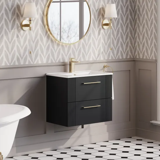 Nuie Deco 600mm Soft Black Wall Hung 2-Drawer Vanity Unit With Thin-Edge Basin