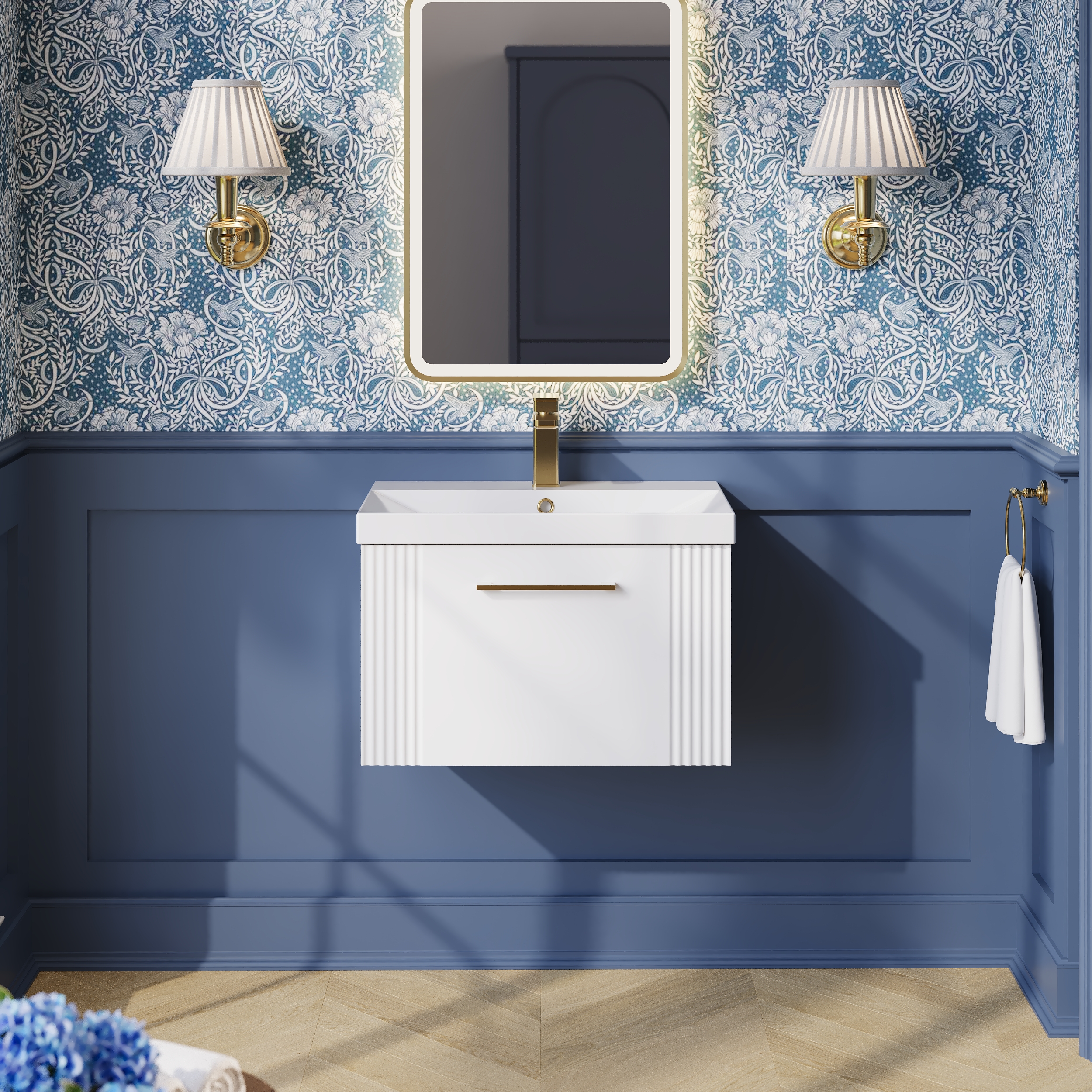 Nuie 600mm Wall Hung Satin White Part Fluted Single Drawer Vanity Unit with Basin With Chrome Handle
