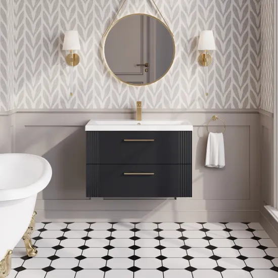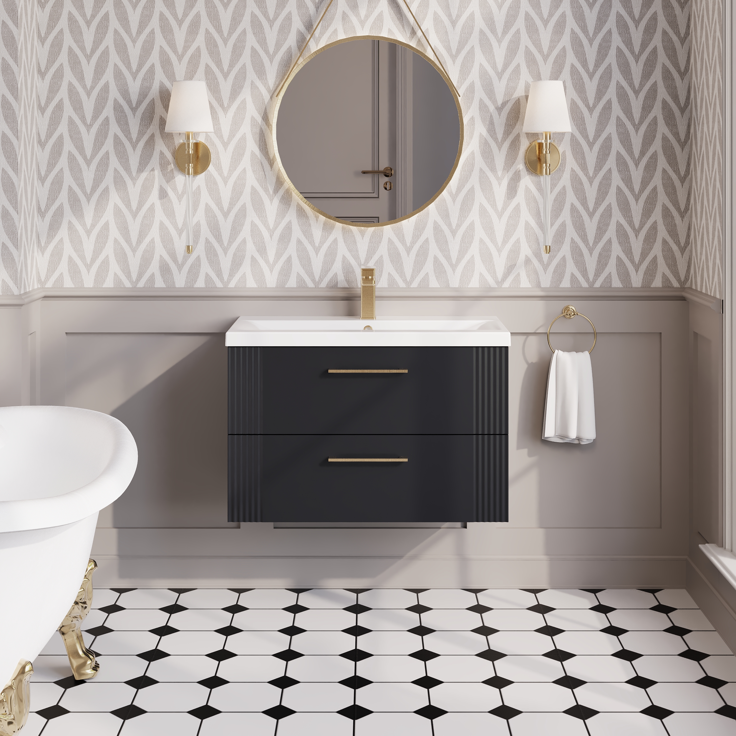 Nuie 800mm Soft Black Fluted Wall Hung 2-Drawer Vanity Unit with White Ceramic Basin With Chrome Handles