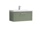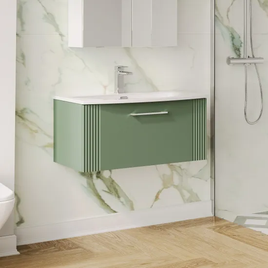 Nuie 800mm Satin Green Part Fluted Wall Hung Single Drawer Vanity Unit with Basin With Chrome Handle