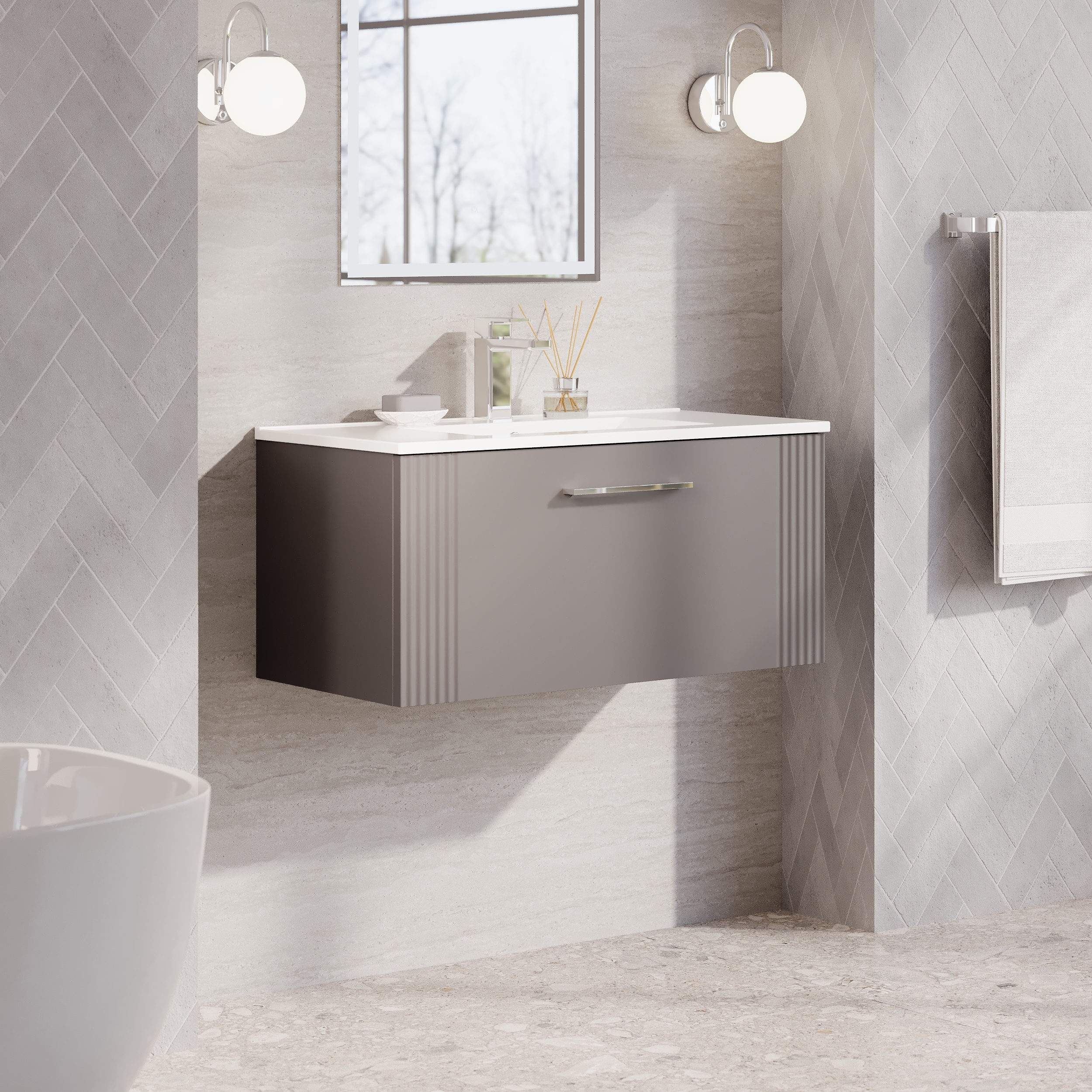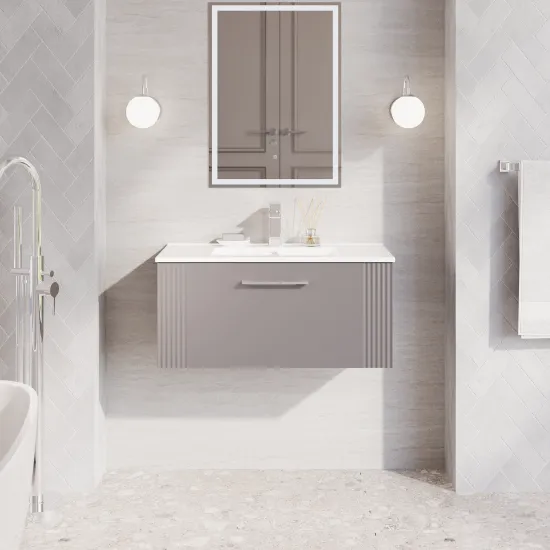 Nuie 800mm Satin Grey Part Fluted Wall Hung Single Drawer Vanity Unit With Basin & Chrome Handle