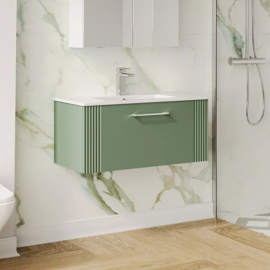 Nuie 800mm Satin Green Part Fluted Wall Hung Single Drawer Vanity Unit with Basin With Chrome Handle