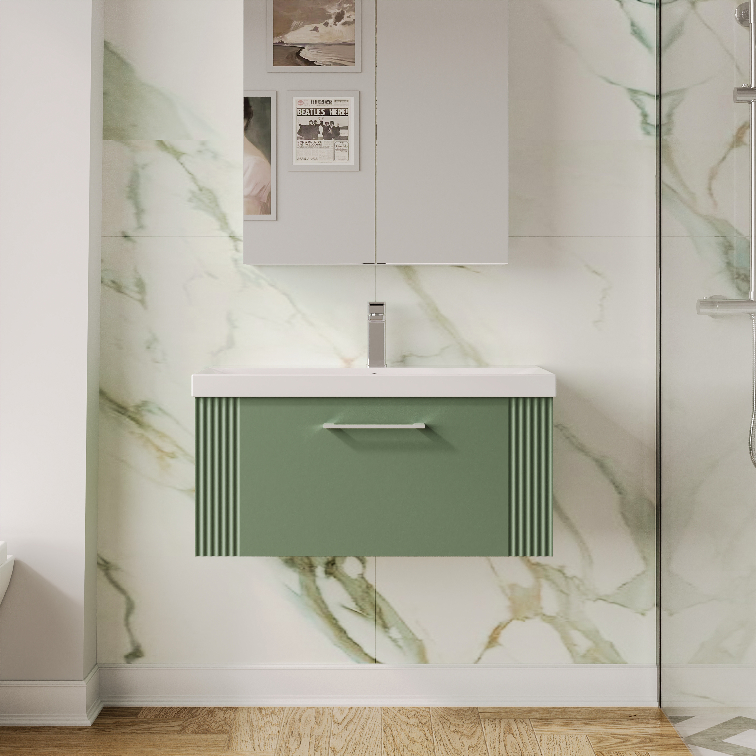 Nuie 800mm Satin Green Part Fluted Wall Hung Single Drawer Vanity Unit with Basin With Chrome Handle