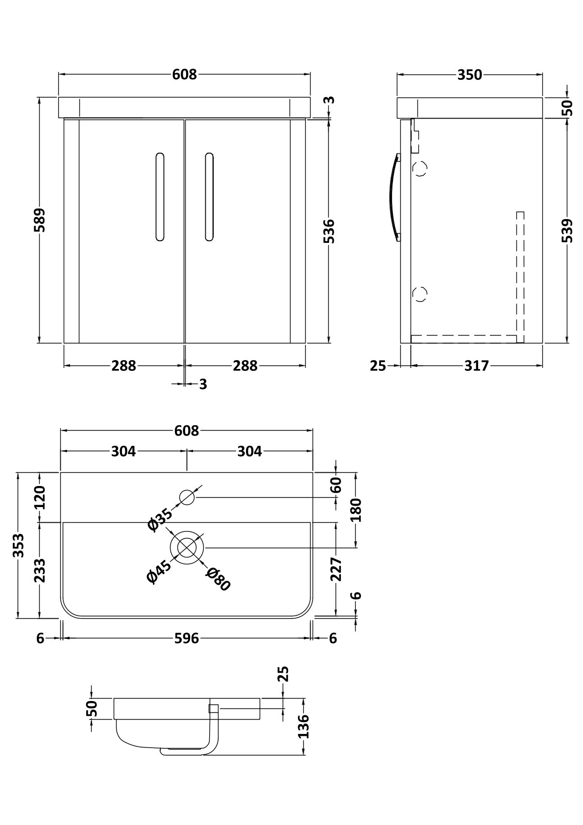 Arley Direction 600mm Wall Hung Unit with Basin - Gloss Grey