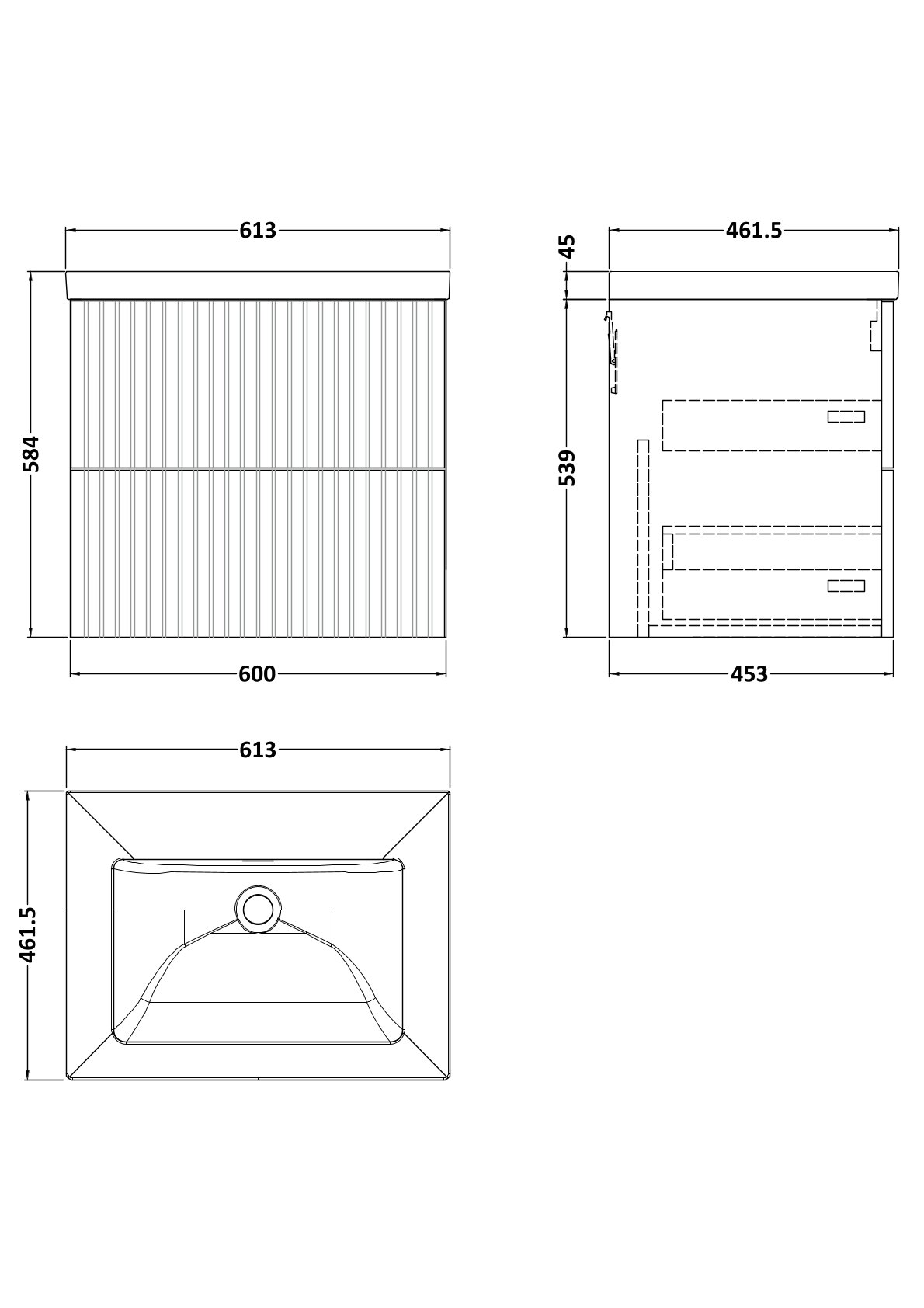 Flume 600mm 2- Drawer Wall Hung Unit with Contemporary Fireclay Basin - 0 Tap Holes