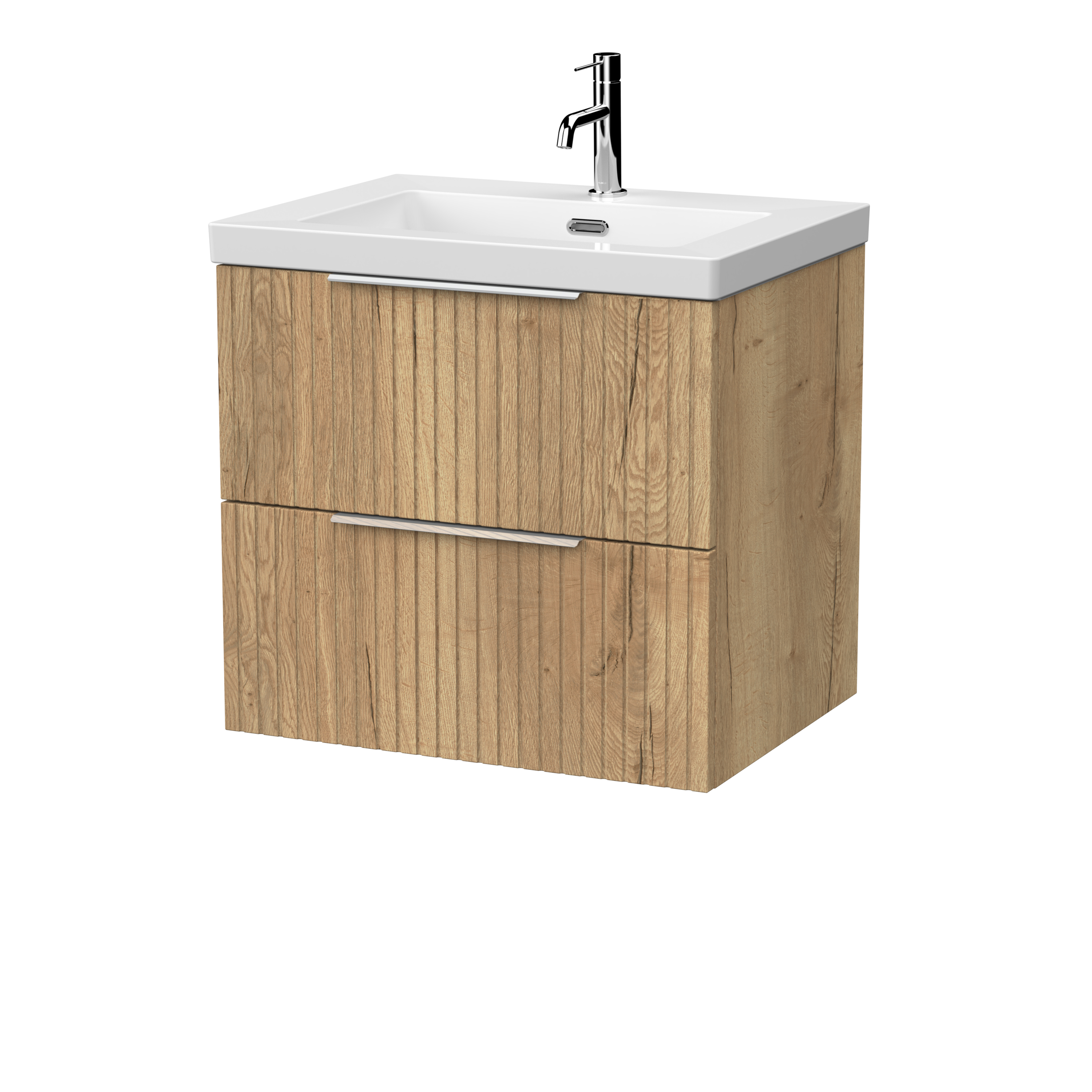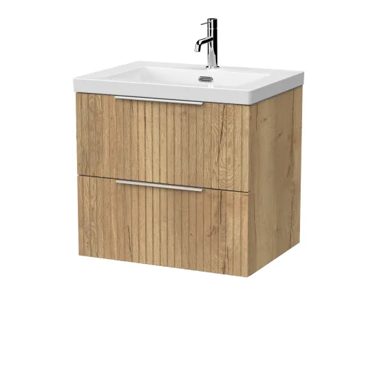 nuie Lux Flume 600mm 2- Drawer Wall Hung Unit with Contemporary Fireclay Basin - 1 Tap Hole - Autumn Oak