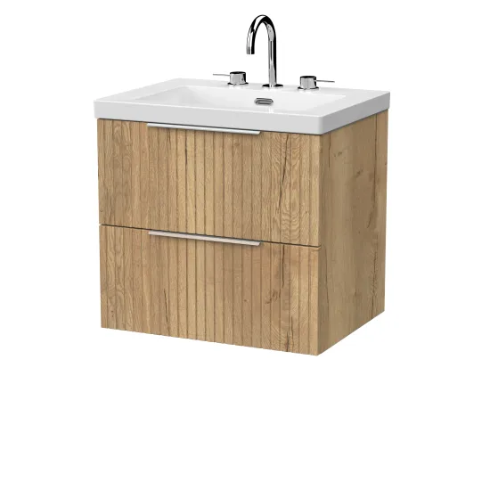 nuie Lux Flume 600mm 2- Drawer Wall Hung Unit with Contemporary Fireclay Basin - 3 Tap Holes - Autumn Oak