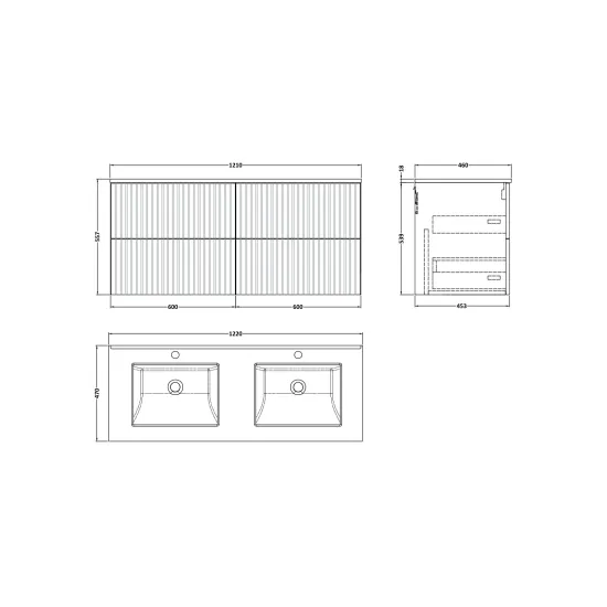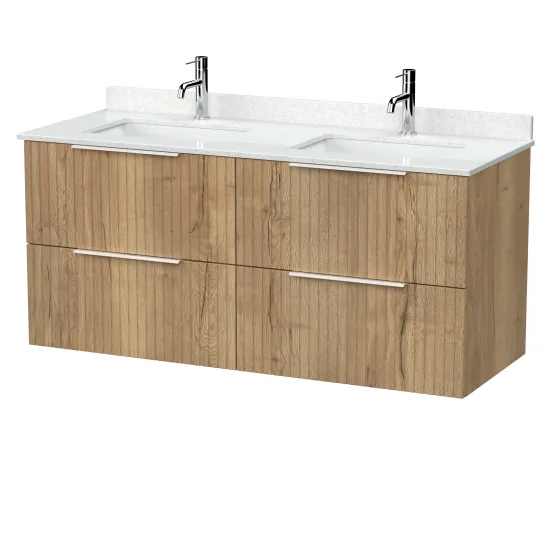 nuie Lux Flume 600mm 2- Drawer Wall Hung Unit with Double Bowl Marble Top 1 Tap Hole in White - Autumn Oak