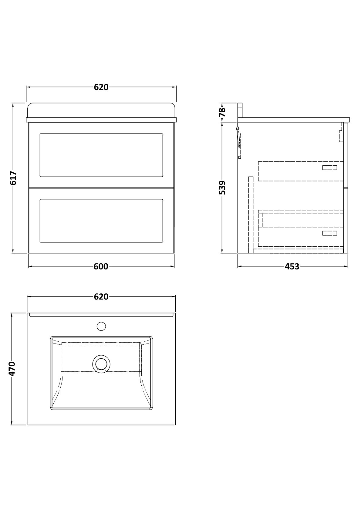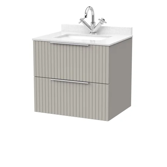 nuie Lux Flume 600mm 2- Drawer Wall Hung Unit with Single Bowl Marble Top 1 Tap Hole in White - Pebble Grey