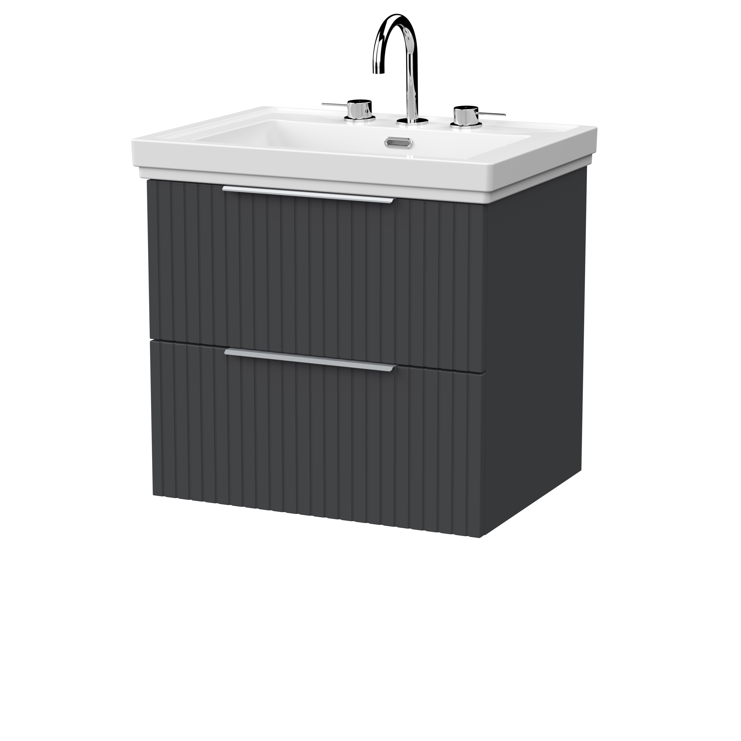 nuie Lux Flume 600mm 2- Drawer Wall Hung Unit with Traditional Fireclay Basin - 3 Tap Holes - Soft Black