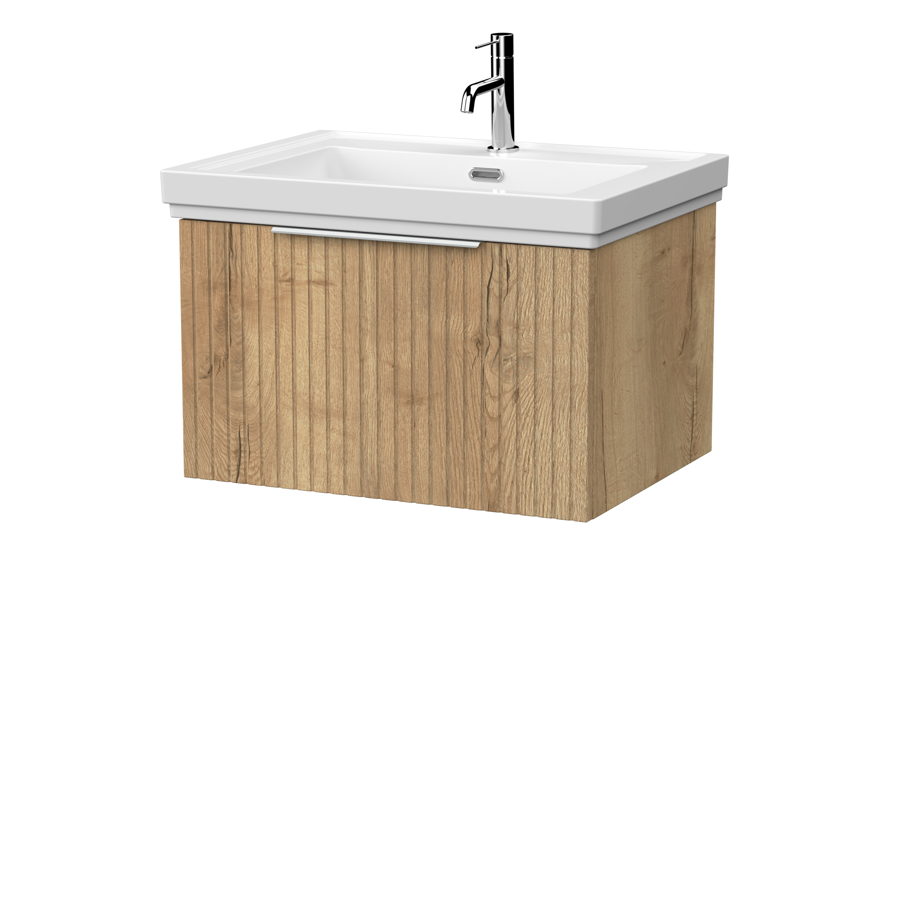 nuie Lux Flume 600mm Single Drawer Wall Hung Unit with Traditional Fireclay Basin - 1 Tap Hole - Autumn Oak