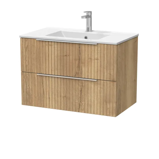 nuie Lux Flume 800mm 2- Drawer Wall Hung Unit with 1 Tap Hole Minimalist Basin Top - Autumn Oak