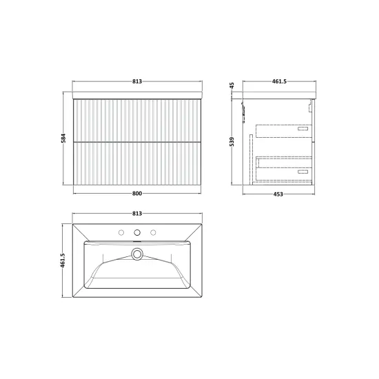 Flume 800mm 2- Drawer Wall Hung Unit with Contemporary Fireclay Basin - 3 Tap Holes