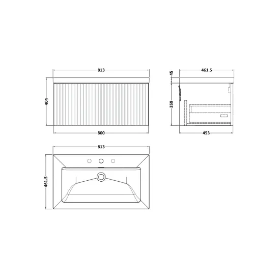 Flume 800mm Single Drawer Wall Hung Unit with Contemporary Fireclay Basin - 3 Tap Holes
