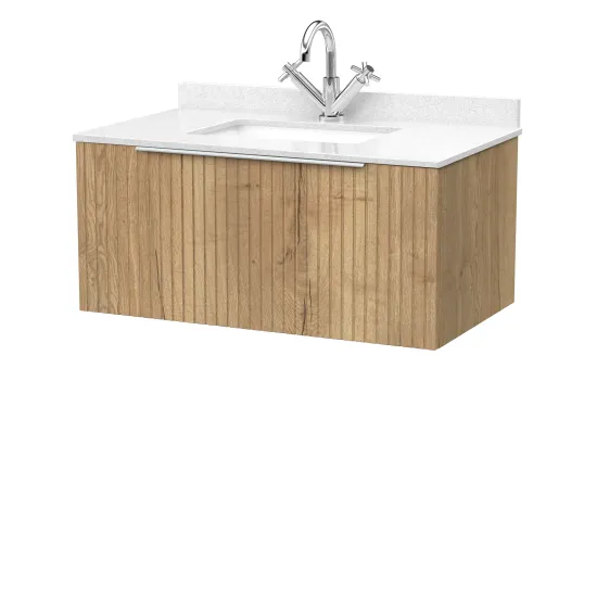 nuie Lux Flume 800mm Single Drawer Wall Hung Unit with Single Bowl Marble Top 1 Tap Hole in White - Autumn Oak