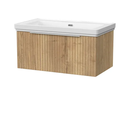 nuie Lux Flume 800mm Single Drawer Wall Hung Unit with Traditional Fireclay Basin - 0 Tap Holes - Autumn Oak