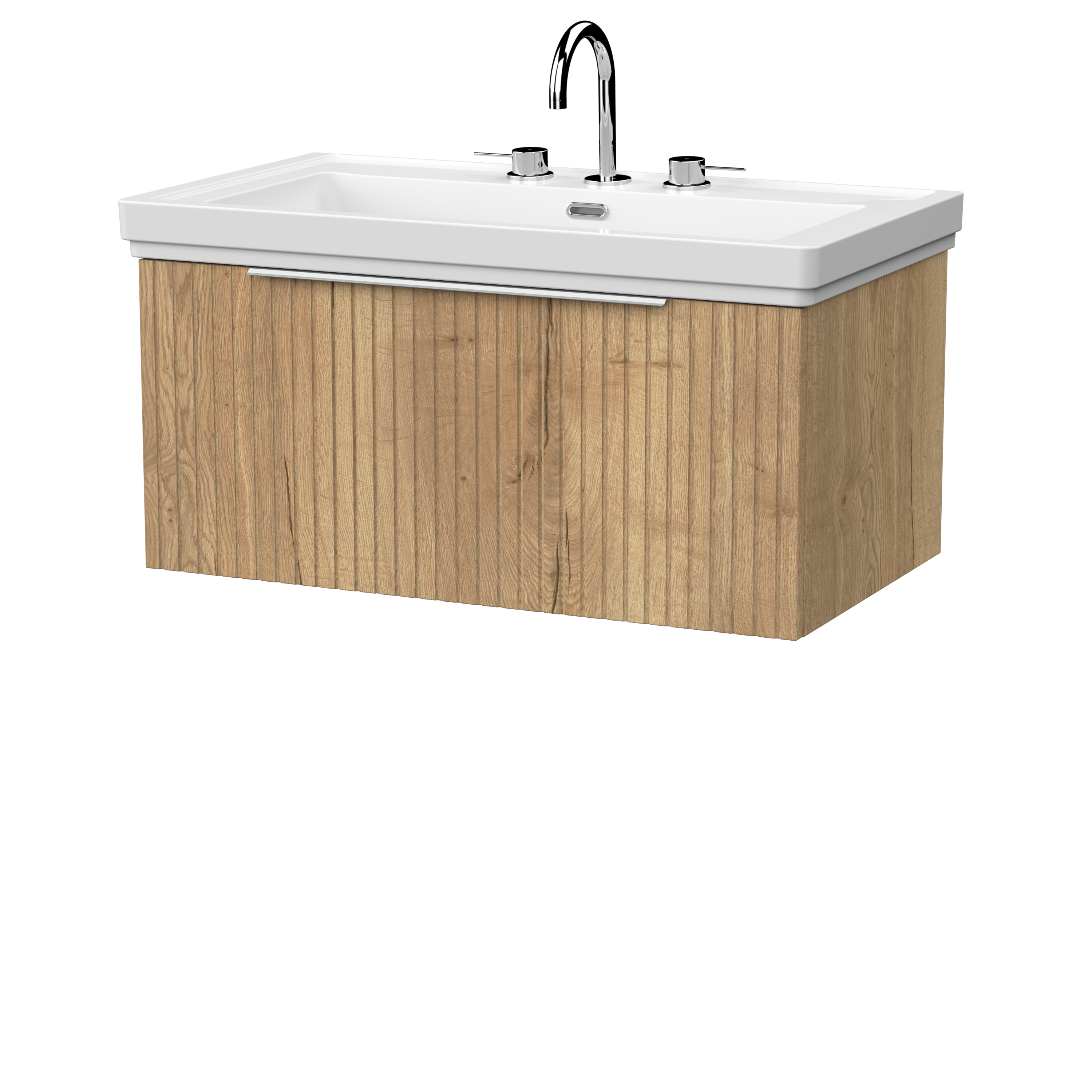 nuie Lux Flume 800mm Single Drawer Wall Hung Unit with Traditional Fireclay Basin - 3 Tap Holes - Autumn Oak