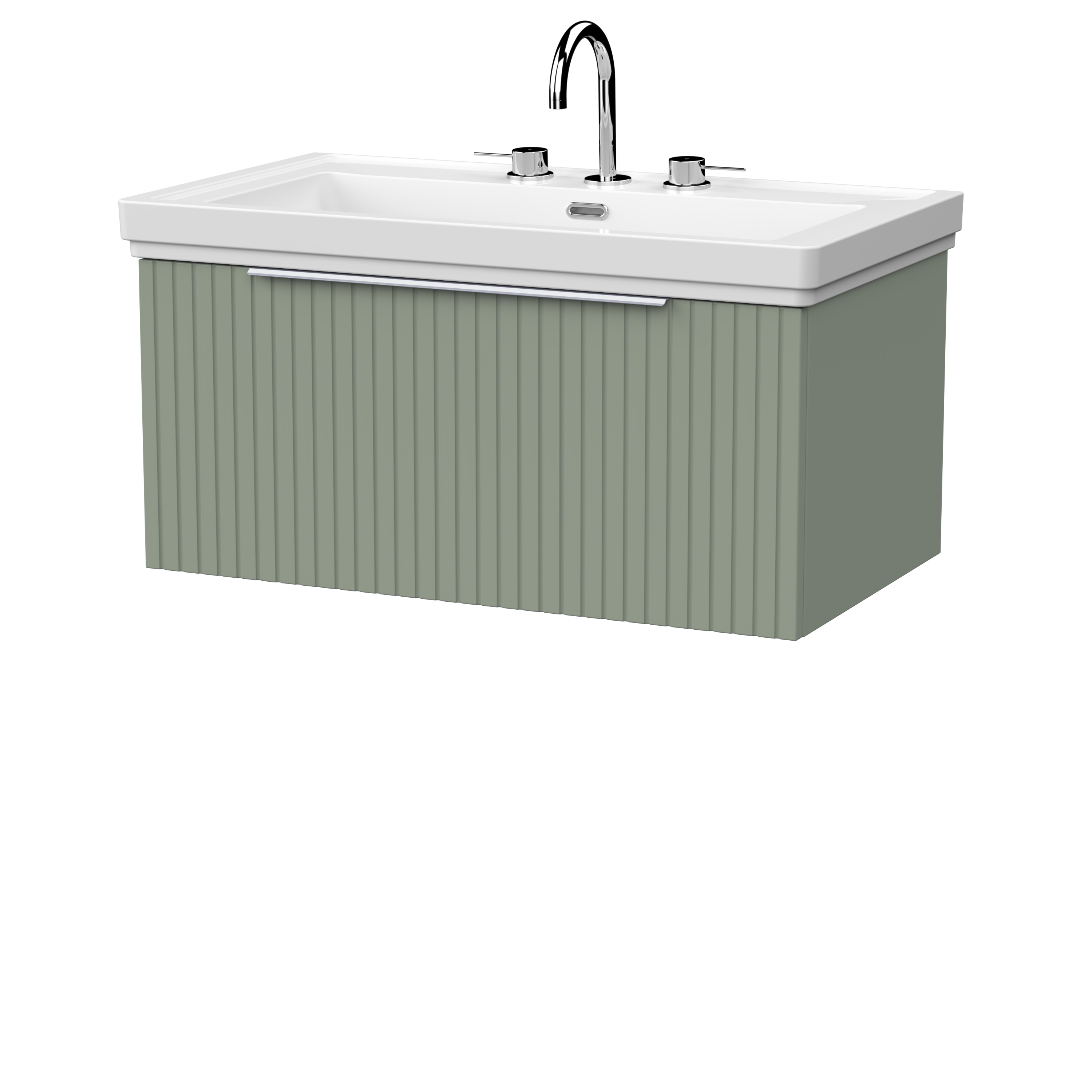 nuie Lux Flume 800mm Single Drawer Wall Hung Unit with Traditional Fireclay Basin - 3 Tap Holes - Fern Green