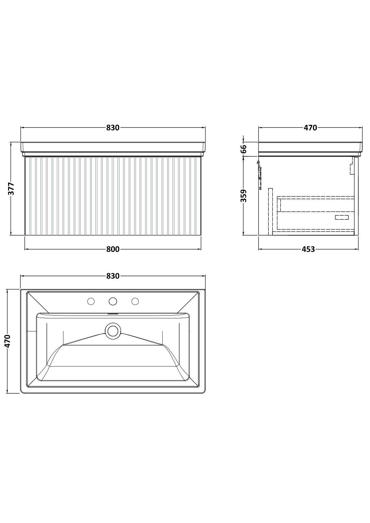 Flume 800mm Single Drawer Wall Hung Unit with Traditional Fireclay Basin - 3 Tap Holes