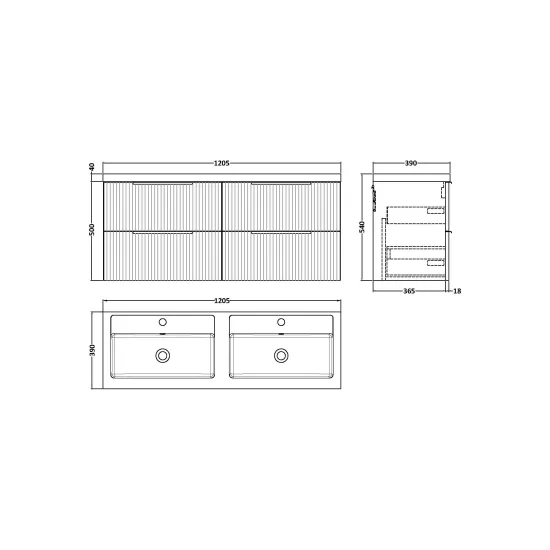 Hudson Reed Fluted 1200mm Wall Hung 4-Drawer Vanity with Double Basin